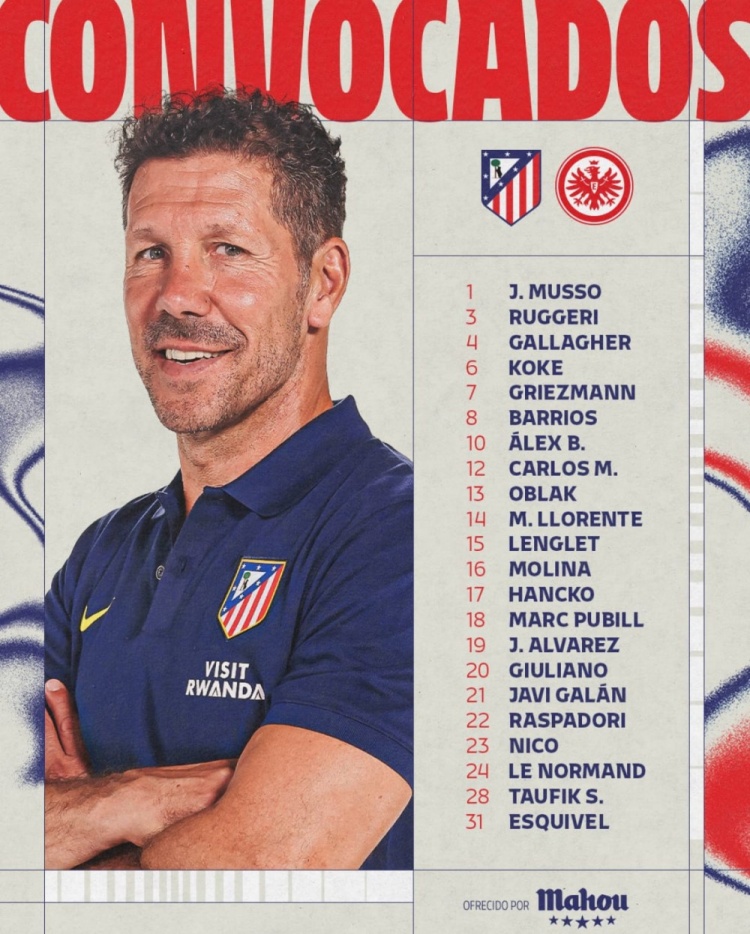 马竞公布了与法兰克福的比赛名单,阿尔瓦雷斯作为队长出战,索尔洛特因伤未能参赛_西甲直播